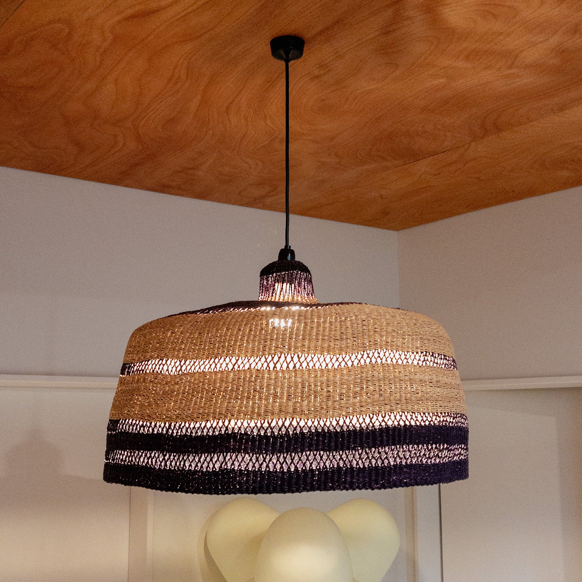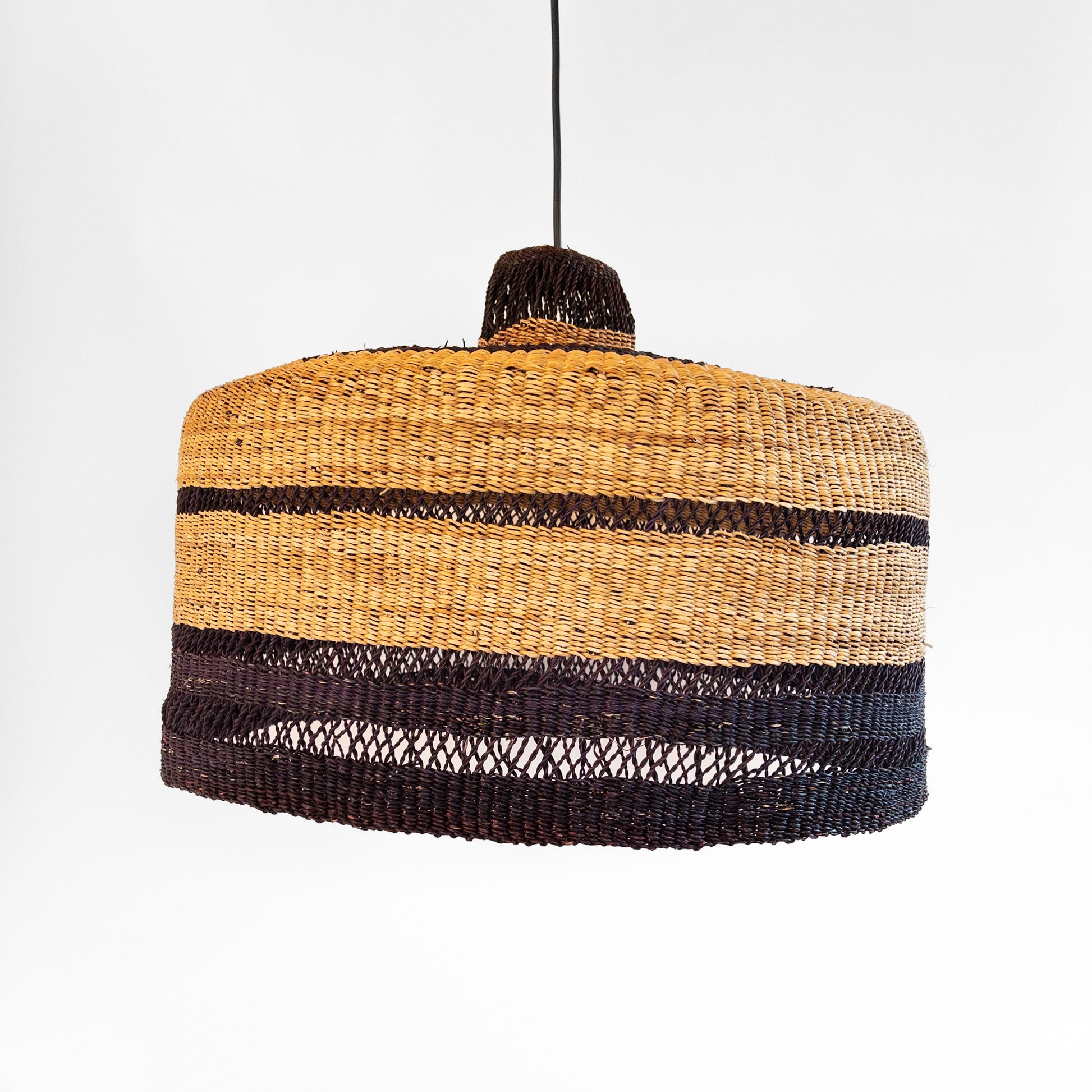 Lampshades woven by Ghanan artisans using elephant grass and dyed with natural pigments.