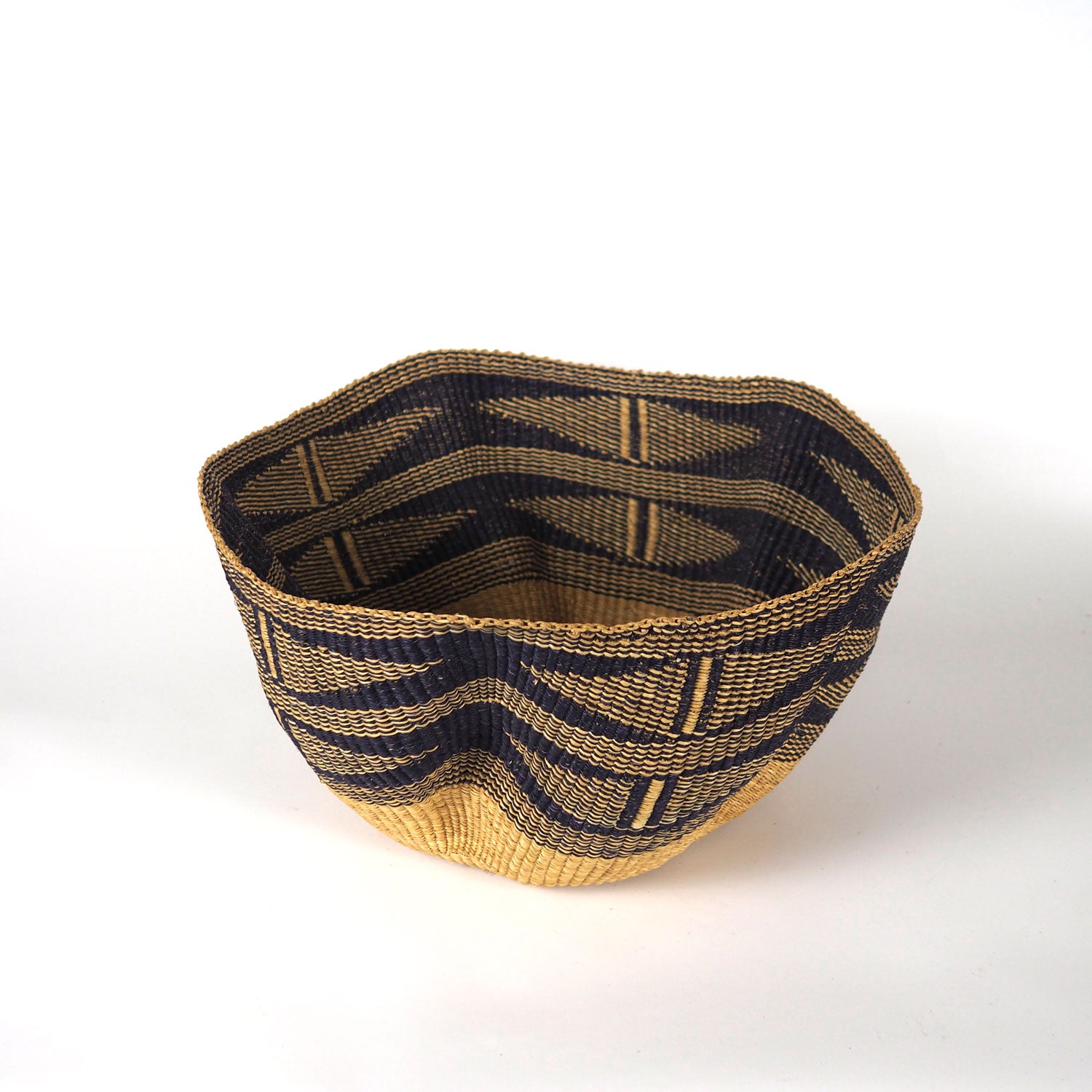 Handwoven baskets for any use, these are our floor baskets. Eclectic and beautifully handmade by Bolga artisans in Ghana, they are coloured with natural pigments and come with a variety of handles. Use them as a wastepaper basket, vase or just as the objét, well, that they are.