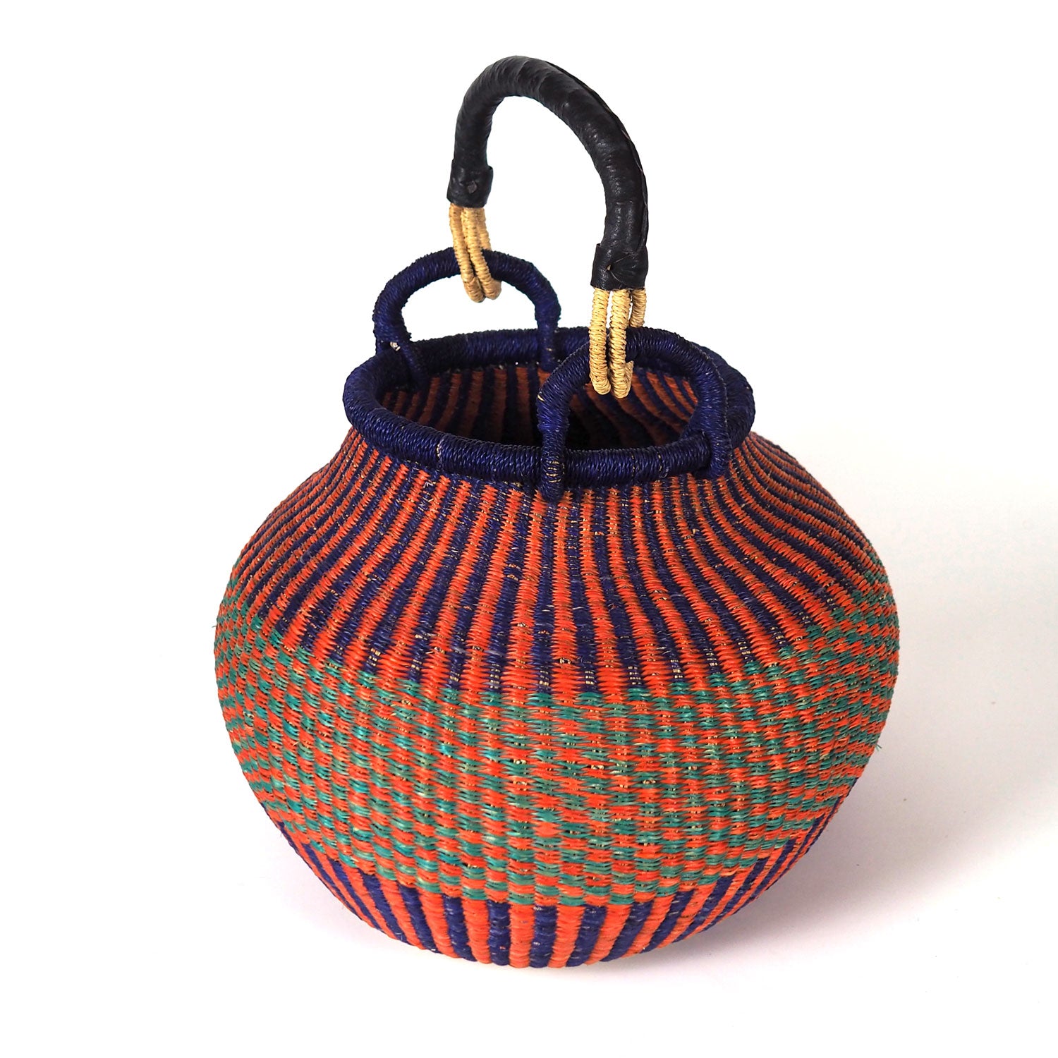 Handwoven baskets for any use, these are our floor baskets. Eclectic and beautifully handmade by Bolga artisans in Ghana, they are coloured with natural pigments and come with a variety of handles. Use them as a wastepaper basket, vase or just as the objét, well, that they are.