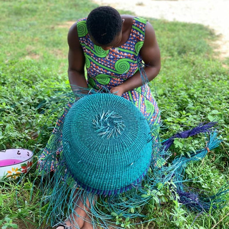 Put a little joy into your laundry with this handwoven washing wonder. Washing becomes a wholesome experience with this beautiful elephant grass laundry basket. Made by Bolga artisans in Ghana, it’s coloured with natural pigments and has sturdy hand stitched goat skin handles. Supple yet strong, this basket will do as many cycles as you can.